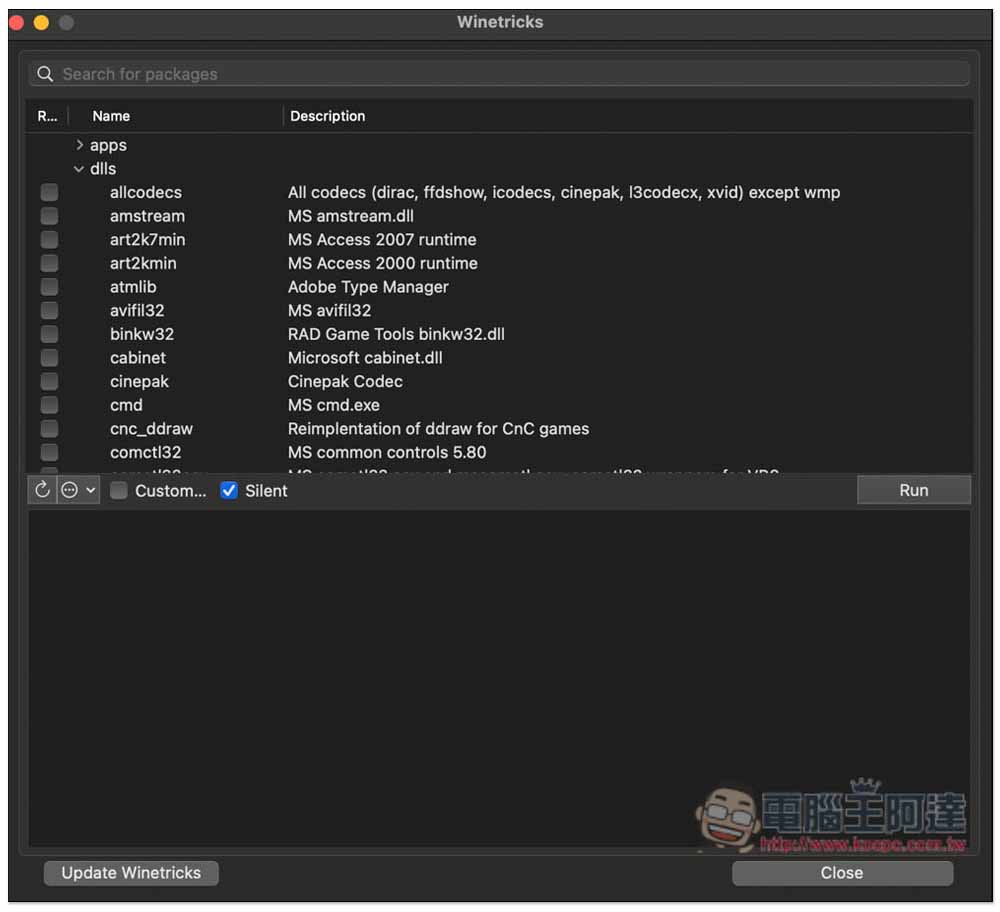 另外打開遊戲或軟體如果有跳出缺少任何 .dll 檔案,可以到 Winetricks 選項裡啟用:
