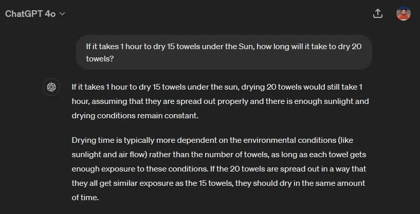 針對這題,ChatGPT 4o 給出完美的答案,考量到現實情況,會跟 15 條毛巾差不多時間,並給出解釋: