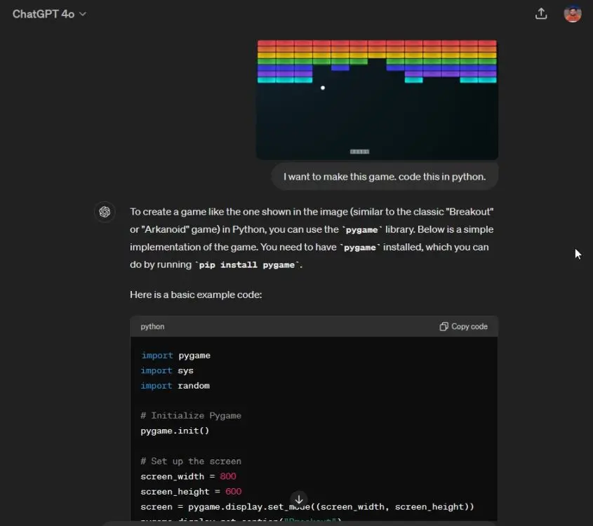 題目很簡單,就只有給一張圖片和要求建立遊戲,ChatGPT 4o 很快就生成出相關程式碼,Beebom 透過 pip 安裝並使用 Python 執行,遊戲成功啟動,沒有任何錯誤,這可說讓人非常驚艷。