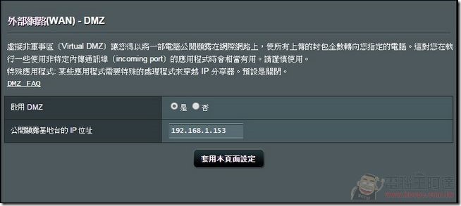 不過要注意的是 DDNS 要對應分享器中的 DMZ 功能,只要指向 Synology DS215j 在區網內的 IP位置即可: