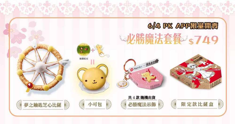 必勝客於 6 月 1 日正式公布與庫洛魔法使合作的消息,必勝客將推出「必勝魔法套餐」,餐點內容物有夢之鑰匙芝心披薩、抹茶紅豆口味小可包、必勝魔法吊飾、限定款庫洛魔法使披薩盒。必勝魔法套餐將在 6 月 4 日於 PK APP 限量開賣,售價為 749 元,庫洛魔法使粉絲們千萬不要錯過!