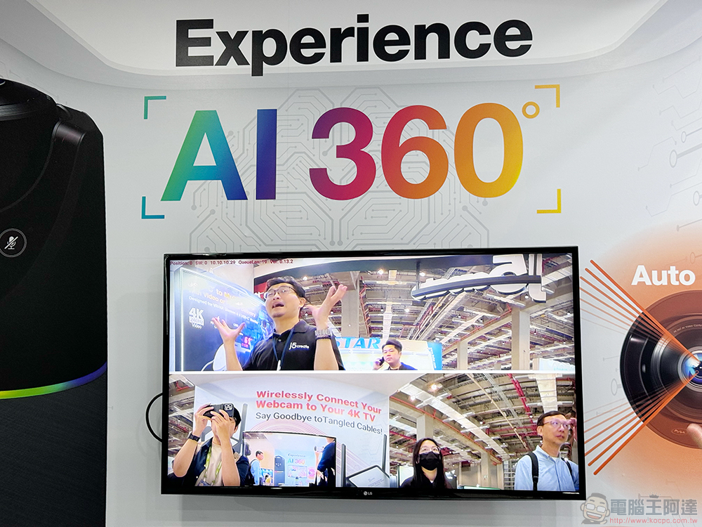 現場也展示了他們的 AI 360 的視訊支援功能 – 能從分別的大頭模式切換到上下排列的寬視角模式。現場的示範則是都藉由 j5create 最高支援 4K60 的無線 HDMI 連接器(JVAW80)與多台電視螢幕與筆電進行連接。