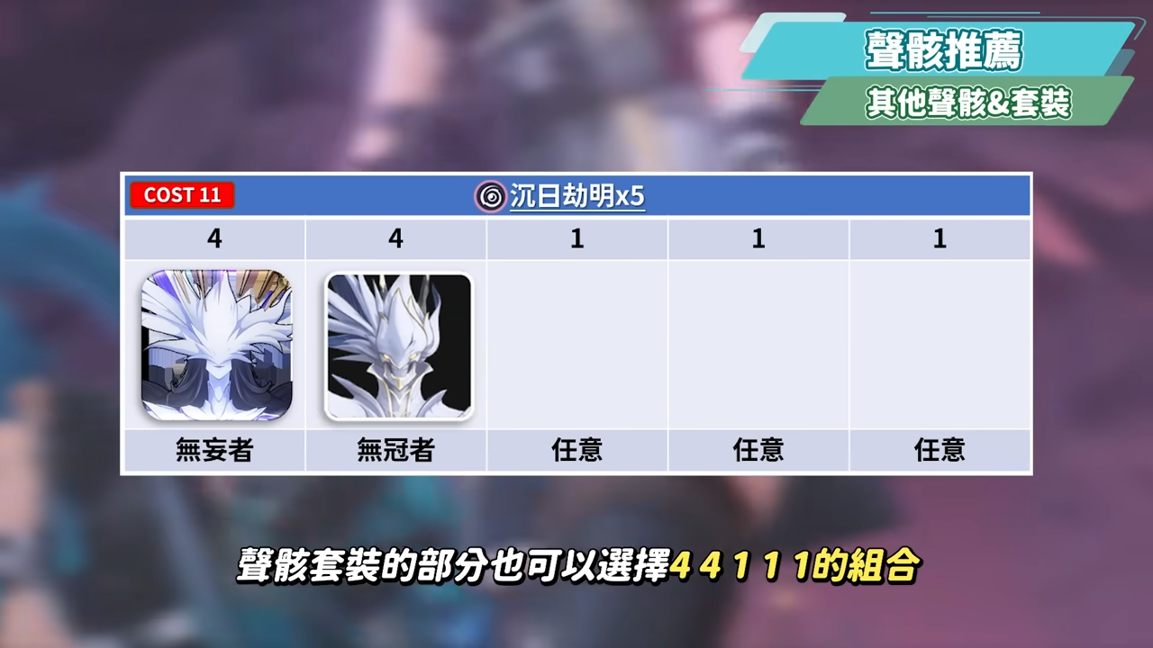 而如果前期暴率還不夠高,比較缺少暴率的情況下,聲骸套裝的部分也可以選擇4 4 1 1 1的組合,也就是無妄者+無冠者,主屬性都選暴率,能夠在湮滅主角6鏈前更好得有足夠的暴率來輸出。