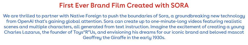 玩具反斗城發布了使用 OpenAI 文字生成影片大模型 Sora 製作的影片,使用輸入文字指令的方式創作出長達一分鐘的影片,故事內容是玩具反斗城創始人 Charles Lazarus 如何在 1930 年代初期構想出 ” 玩具反斗城 ” 這個標誌性品牌和深受大家喜愛的吉祥物長頸鹿 Geoffrey 。