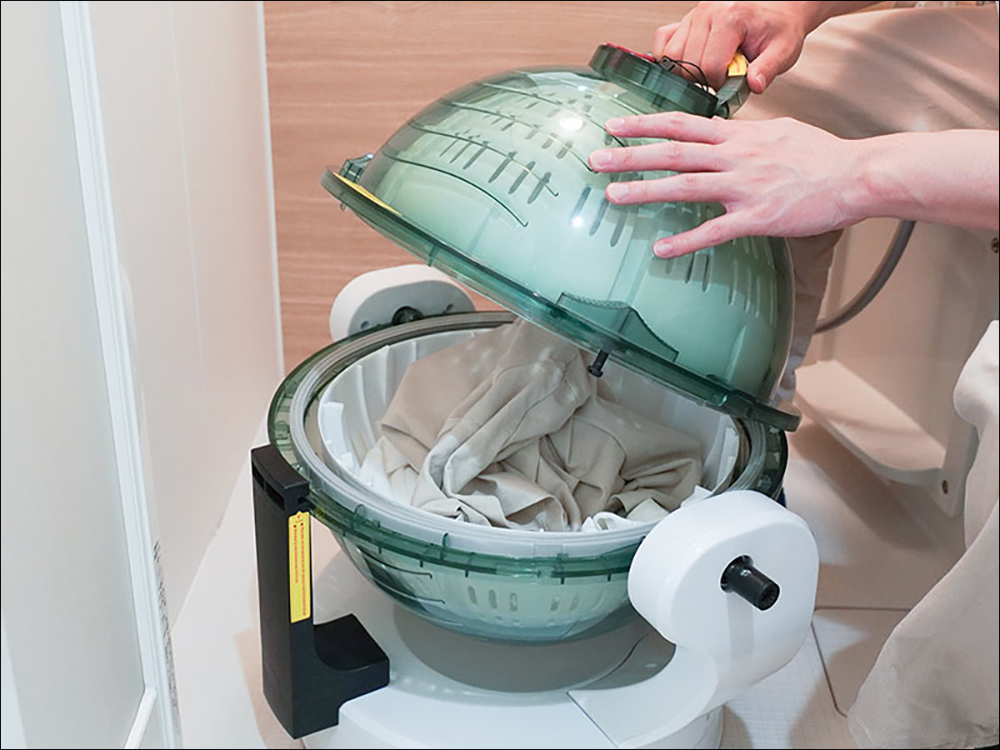 洗衣模式時要將把手安裝在側邊的轉軸,雙向旋轉手把時讓球體前後轉動;脫水模式時,則是將把手安裝在正上方,讓球體左右轉動利用離心力將衣物的水分脫乾。