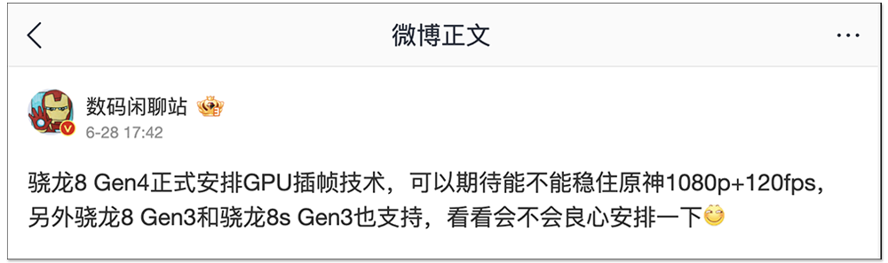 驍龍 8 Gen4 正式安排 GPU 插幀技術,可以期待能不能穩住原神 1080p+120fps,另外驍龍 8 Gen3 和驍龍 8s Gen3 也支持,看看會不會良心安排一下