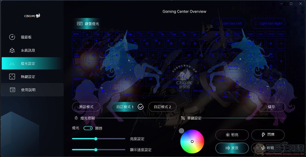 C件鍵盤部分則是搭載全尺寸的新版創作者彩虹鍵盤,具備 N Key Rollover防鬼鍵功能,並可透過 Game Center 調節 各種 RGB 燈效與快捷組合鍵,數字鍵盤區域按鍵尺寸略小一些,不過使用幾次也可以很快上手,喜傑獅還有設計風扇轉速與超頻快捷鍵,使用起來也很直覺。不過 PRTSC 位置在右下角,需要一點時間適應: