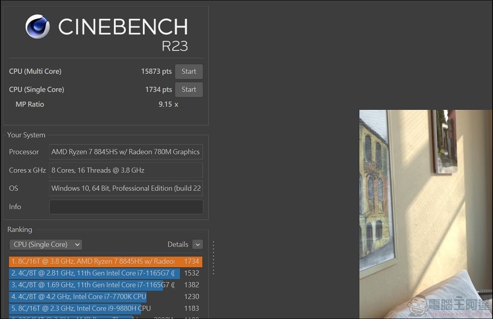 效能測試部分 CINEBECH R23 單核 1734 pts、多核 15873 pts: