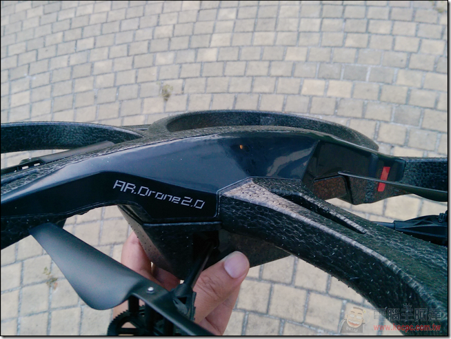 側面特寫,AR. Drone 2.0 的螺旋槳下方腳架剛好可以讓機身平穩的放置在地面: