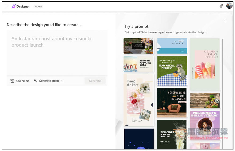 如果有用過微軟整合 OpenAI DALL-E 圖片生成服務的「Image Creator」的話,相信大家應該會覺得 Microsoft Designer 相當眼熟 – 因為它還真的在其中,不過功能也更延伸至可以針對社群使用提供不同版面以及設計的功能。