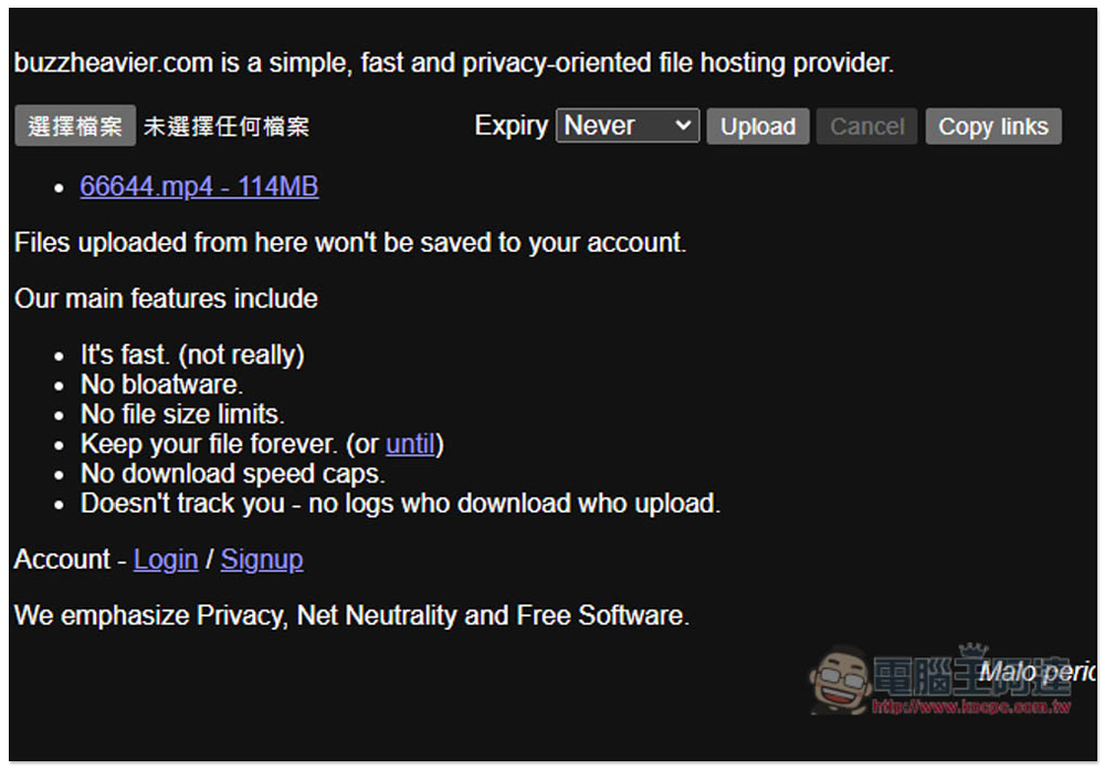 當然,即便 BUZZHEAVIER 表示他們非常安全且匿名,還是不建議在上面存放重要檔案,只推薦給用在分享不重要檔案。