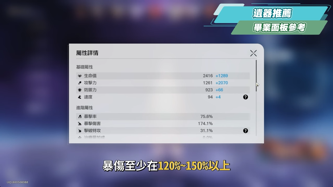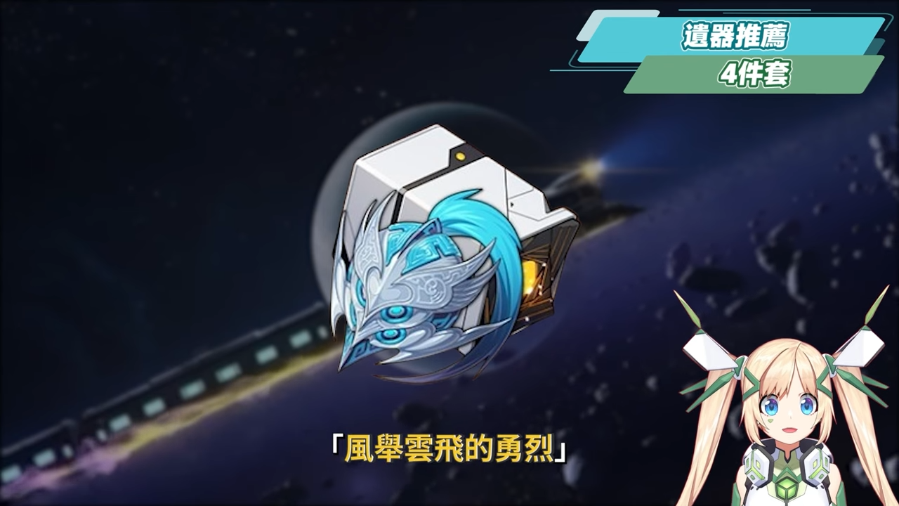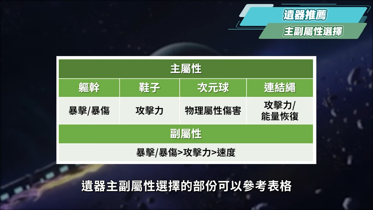 遺器主副屬性選擇的部份可以參考表格,軀幹根據面板所欠缺的選擇暴率或暴傷,鞋子選擇攻擊力,次元球選擇物理屬性傷害,連結繩優先選擇攻擊力,若是隊伍中缺少回能輔助,或是搭配加攻輔助的角色,則可以看情況配戴能量恢復效率。