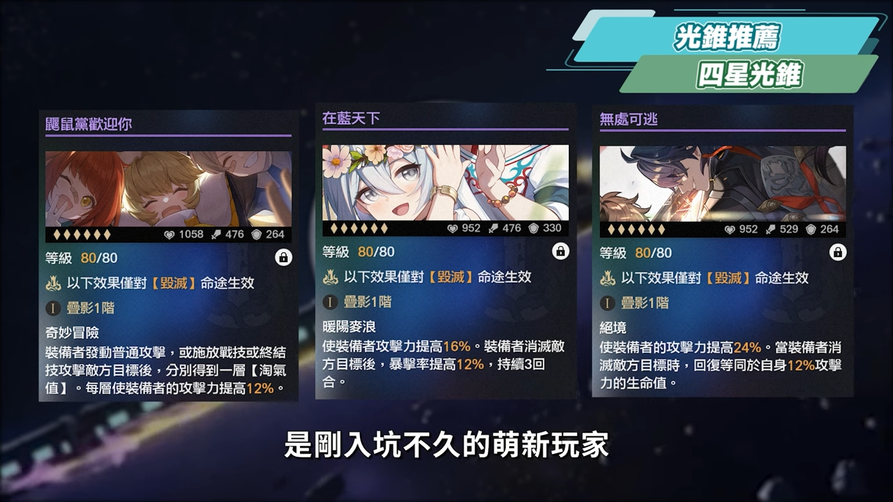 四星光錐可能就屬於是剛入坑不久的萌新玩家,還沒能刷模擬宇宙來兌換光錐的時期,從前面說的邏輯,加攻和增傷的光錐都能用,因此符合的四星光錐像是「鼴鼠黨歡迎你」、「在藍天下」、「無處可逃」等等,但還是盡量以「記一位星神的殞落」為畢業目標。