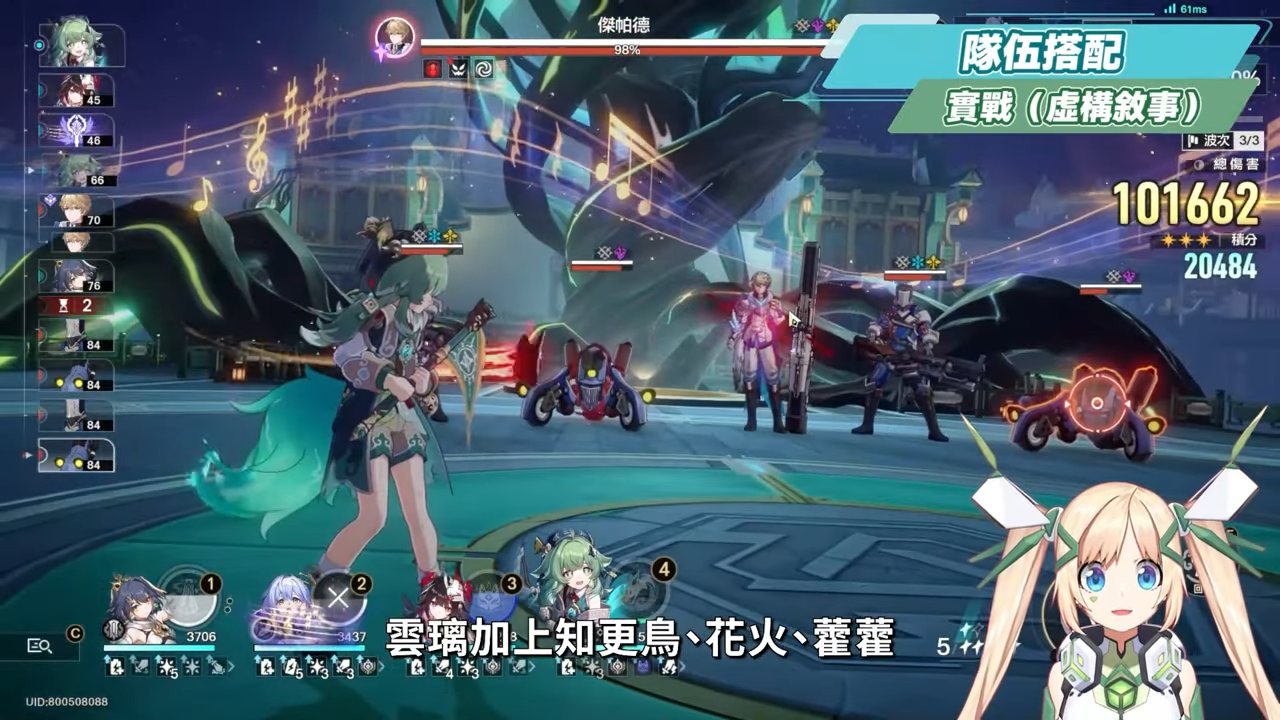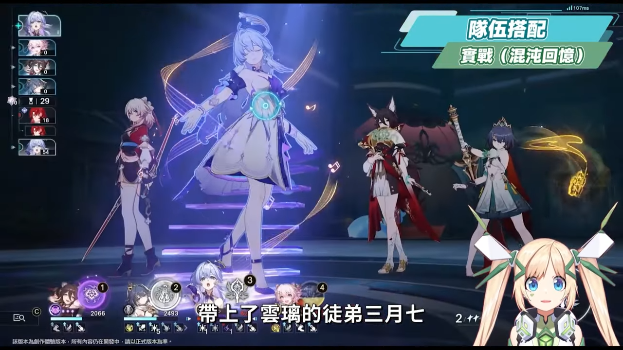 混沌回憶實戰的部份,在確保回能的情況下,帶上了雲璃的徒弟三月七,0+0的雲璃在混沌回憶的實戰中也是直接0T通關,相關的練度和遺器參考也可以查看頻道上另外一支影片。