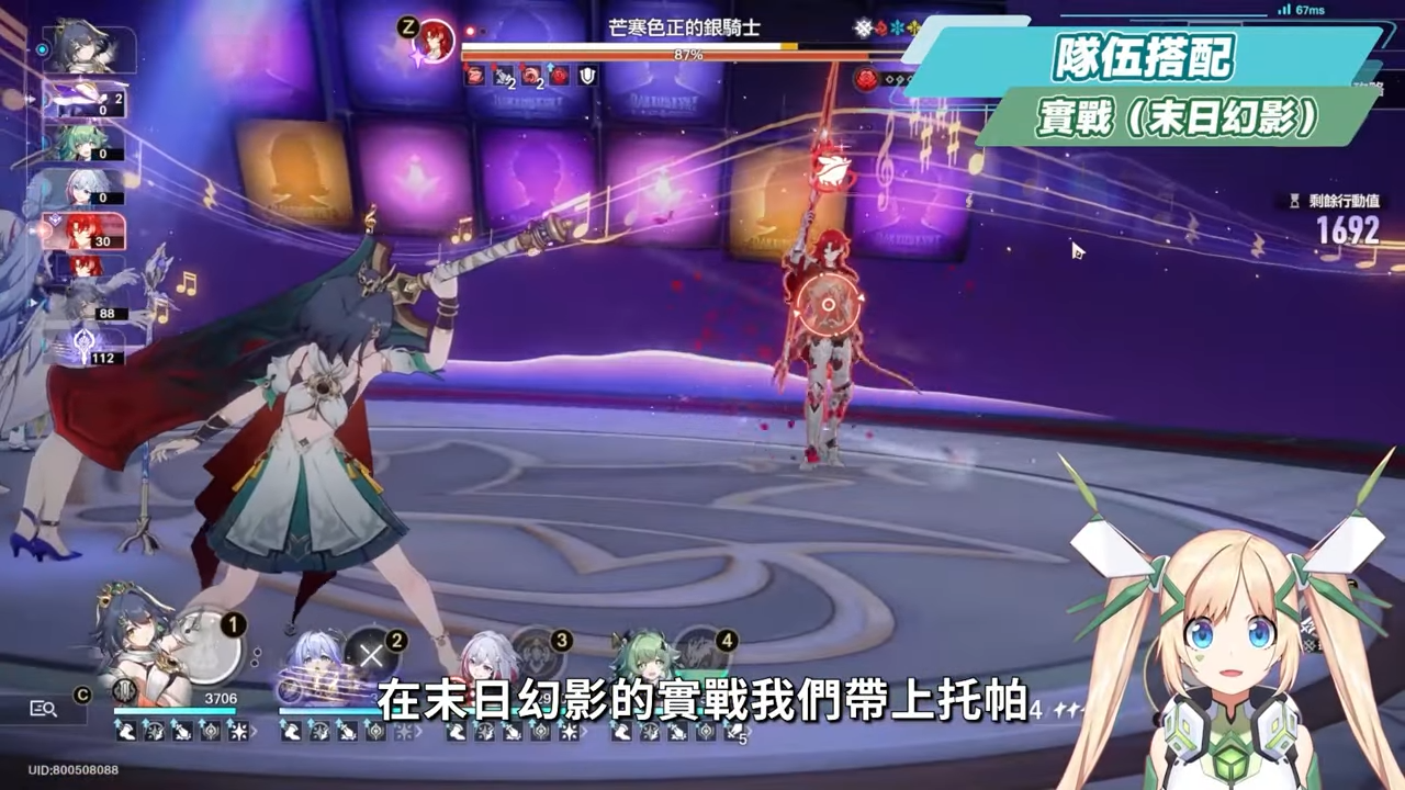 在末日幻影的實戰我們帶上托帕,加強雲璃的追擊易傷之外,托帕提供BUFF的同時也可以幫忙補充輸出,而雲璃的終結技反擊額外彈射也可以應付單體的BOSS,在很多環境都非常吃得開。