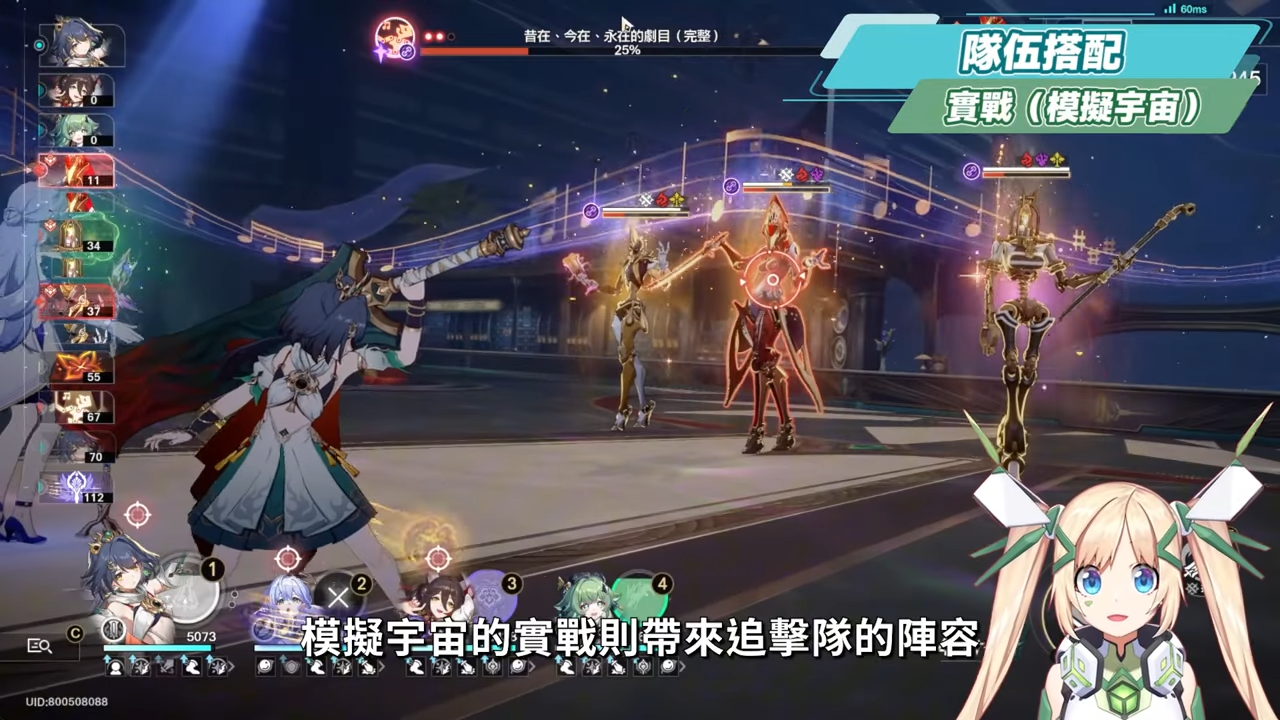 模擬宇宙的實戰則帶來追擊隊的陣容,把真理醫生的位置換成雲璃,若是擔心砂金會搶仇恨也可以換成藿藿,不過實戰中體感上是影響不大,還是可以打的,將真理醫生置換掉後,也讓這隊追擊隊更有對群的能力,算是增加了追擊隊的變化性。