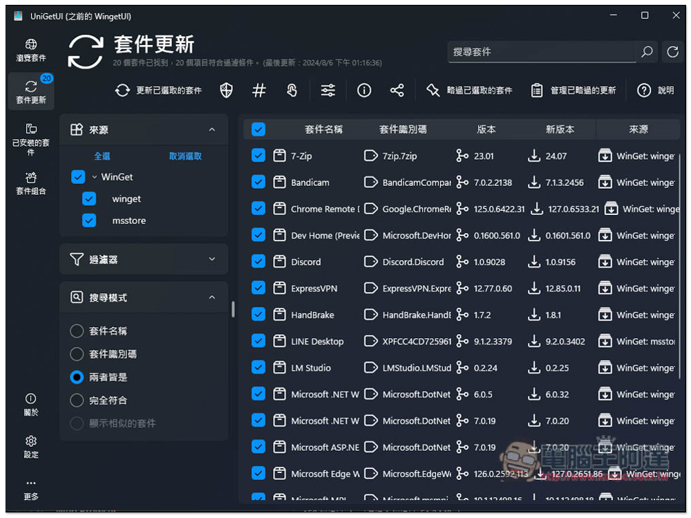 電腦用久了,一定安裝不少軟體,有時候都會收到有新版本更新,而每一款軟體都要手動更新,這過程可說耗時又繁瑣,這篇就要推薦一款非常好用的 UniGetUI,它是一款開源軟體,可一鍵更新電腦裡所有軟體版本,無論是從網路上抓、還是從微軟商店安裝都行,這真的蠻厲害的。