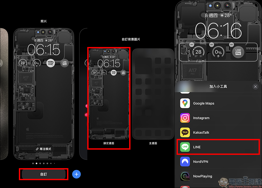 - 進入鎖定畫面自訂模式,選擇要加入的小工具,這裡我們先選擇「LINE」