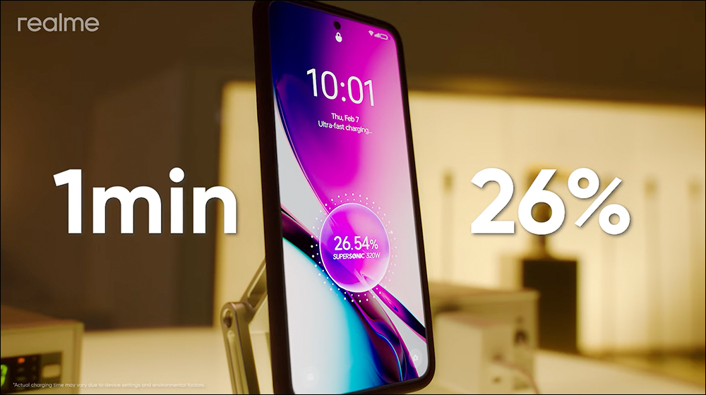 在 realme 官方釋出的短片, 320W SUPERCONIC 快充在短短 1 分鐘就充電 26%。