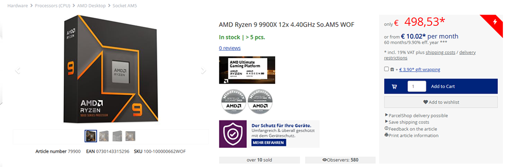 在 Mindfactory 網站上,現在 AMD Ryzen 9 9900X 已經調降成 499 歐元,比起官方建議售價 539 歐元,下降了 8%,歐洲市場這顆普遍都在 499 歐元至 549 歐元之間: