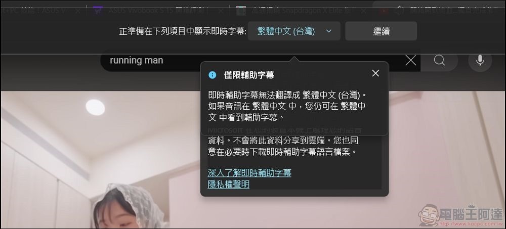 不過目前繁體中文的部分尚未支援,只能顯示出輔助字幕,要等待後續微軟更新才能正常的進行即時字幕翻譯: