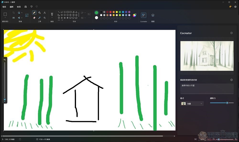 小畫家Cocreator的部分就非常有趣,讓你的小畫家瞬間進行了大改版,現在只要打開小畫家,你的右邊就會多出一個Cocreator的欄位,他不像是DALL-E或是Stable Diffusion是直接透過文字生成圖片,他是配合了你現在畫的圖,搭配文字描述去生成圖片: