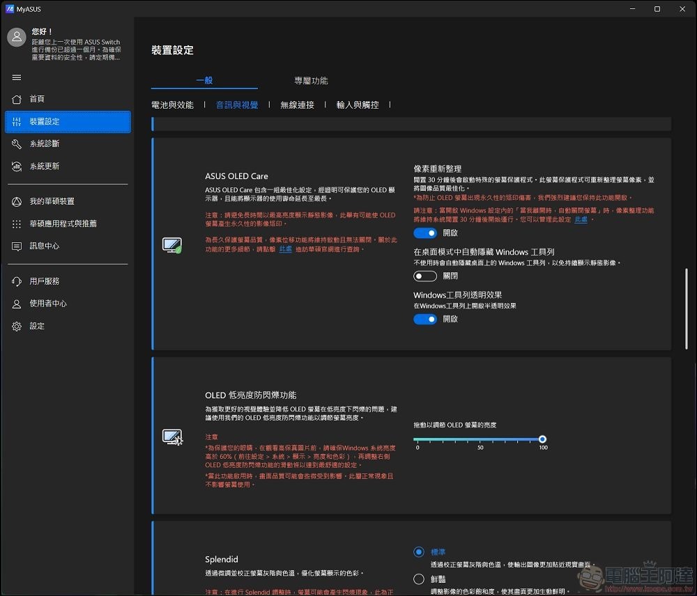 視覺的部分則是可以針對OLED的各項參數進行調整,裡面最為重要的就是ASUS OLED Care,OLED什麼都好,就是貴了點跟會有烙印的缺點,而ASUS OLED Care就是為了防止烙印的產生所開發出來的小工具,他會在一定時間內像素重新整理,避免OLED長時間處於靜態狀態下可能產生的烙印: