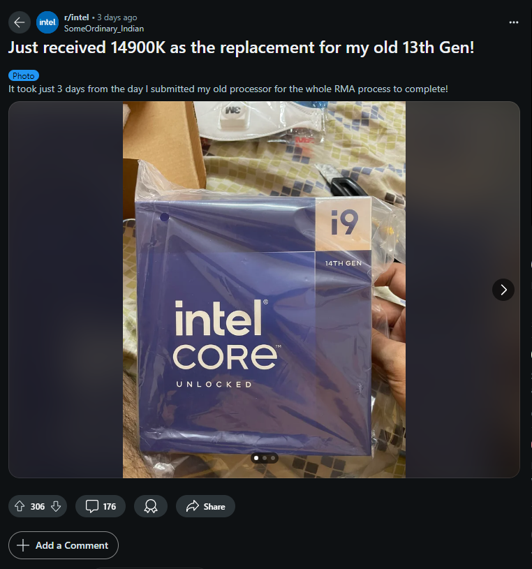 另外在 Reddit 論壇,另一位 SomeOrdinary_Indian 則分享,他將自己的 i9-13900K 送 RMA 後,只花了三天就拿到替換品,而且還免費升級到 i9-14900K,不用負任何一分錢: