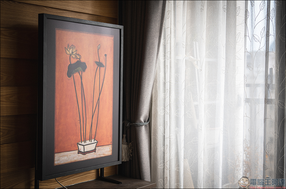 《淨・畫》機身僅有 9 公分厚度,為業界最薄款式,輕盈的設計可懸掛於牆面,不佔用地面空間,全機搭配畫框與畫作僅 10.4 公斤,成為居家裝飾的一部分。