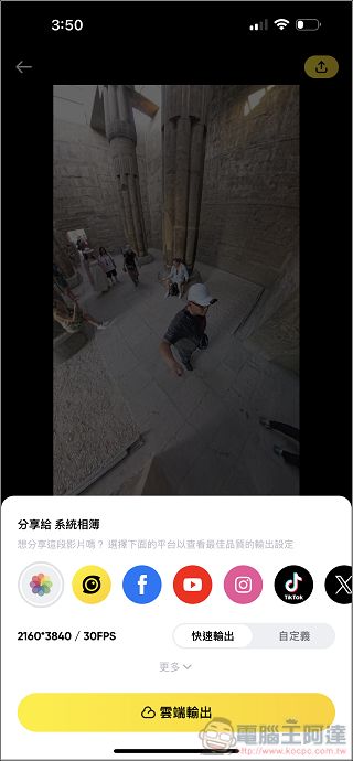 當然 APP 剪輯好的影片也可以直接雲端輸出,開始導出後就可以退出 APP 了,不佔用手機算力,不像平常時就必須停留在APP畫面中不可退出,影片越長就要等越久: