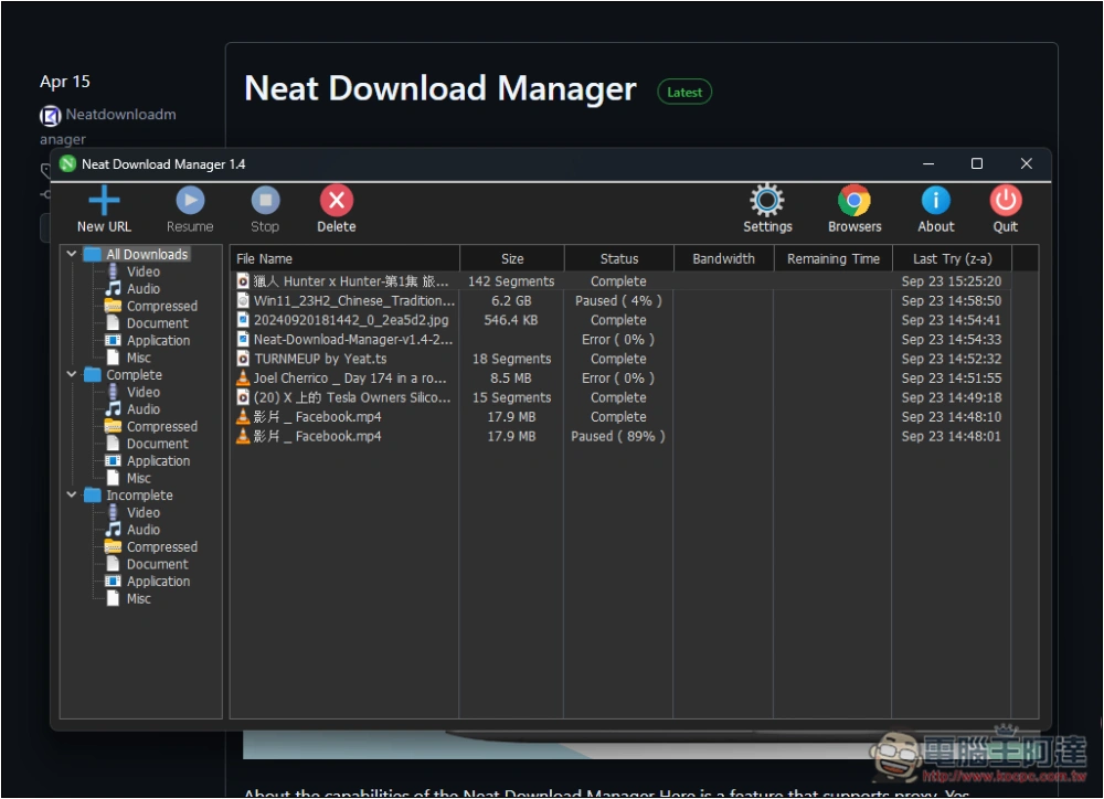 Neat Download Manager 是最近發現到很不錯用的輕量下載器,不僅下載速度快、可控管每個下載檔案的速度、具備分類功能,只要安裝主程式和擴充功能後,很多社群、影音網站的影片,都能直接在網頁上一鍵下載,不用再透過其他下載工具,Windows、Mac 都支援。