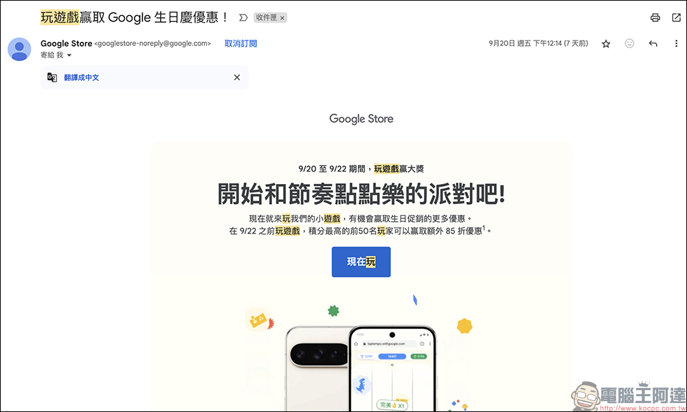 Google 生日慶活動開始前,上週只要有訂閱 Google Store 電子報的人應該都有收到一封「玩遊戲贏取 Google 生日慶優惠!」為標題的信件,這遊戲本身已經過期,但是這封信底下其實有偷偷贈送給消費者這次生日慶可使用的折扣碼!