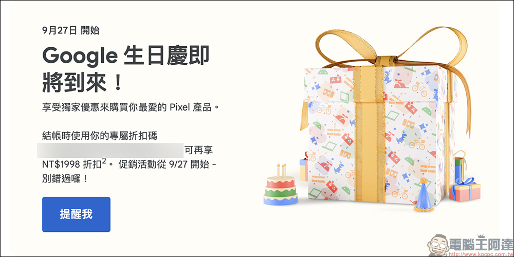 在該信件底下,會看到一組專屬折扣碼,而這組折扣碼從即(27)日 Google 生日慶可使用。