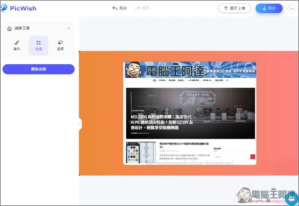 像我用 PicWish 的免費去除浮水印功能,就輕輕鬆鬆去掉: