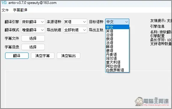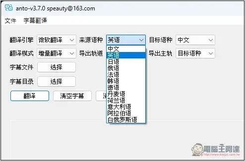 來源/目標語種會根據你使用的翻譯引擎而改變,像我用微軟翻譯,來源部分支援中文、英語、日語、俄語、法語、韓語、德語等,來源語言就是字幕原本的語言: