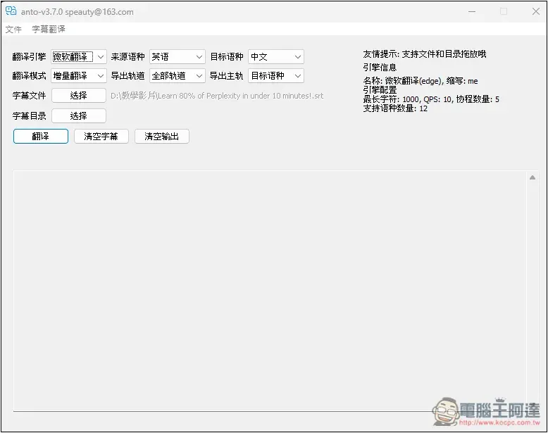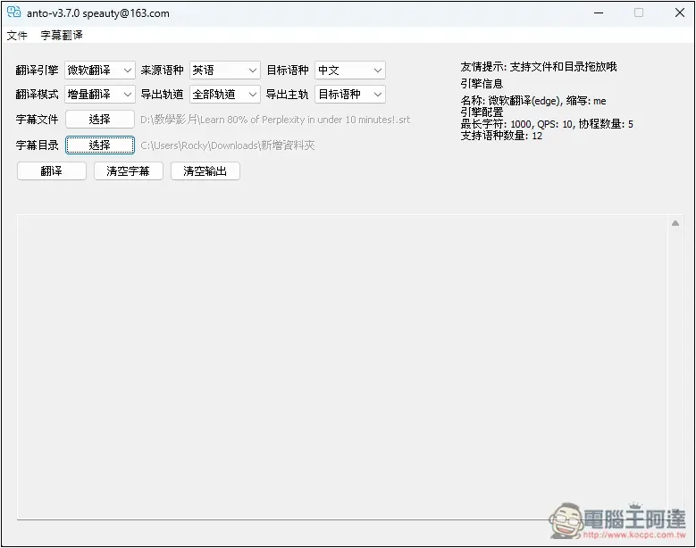 ANTO 介面是有一點陽春,但不會難就是。打開工具之後,首頁就是字幕翻譯,先選擇你要使用的翻譯引擎,右邊都會提示支援的最長字符,看不太懂沒關係,就先翻譯,完成後檢查是否有全部都翻完,沒有的話另外創建一個字幕檔再次翻譯就好: