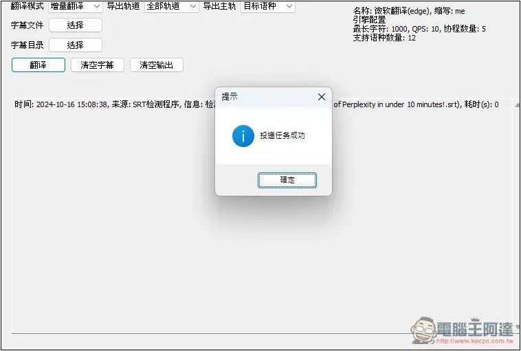 等待個幾秒鐘,畫面顯示翻譯完成,就代表成功了,翻譯好的字幕檔,會自動儲存在原字幕的資料夾: