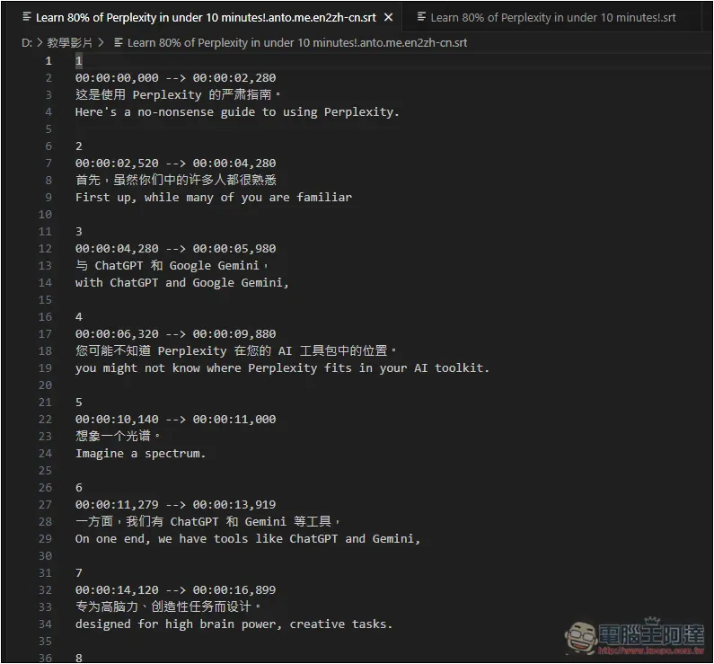 透過這工具翻譯後的中文字幕,不只是翻譯成字幕,還保留原來的英文,變成雙字幕版本: