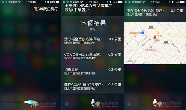 ▲來到陌生的地方,你可能不知道附近有什麼餐廳、飲料店、或是便利商店,這時就可以問 Siri,用最生活的方式來問也沒問題,像是「我肚子餓了」、「我口渴了」、或是「7-11」,Siri 都會懂,除了 Show 出有哪些資訊,還會帶領你怎麼到那邊。
