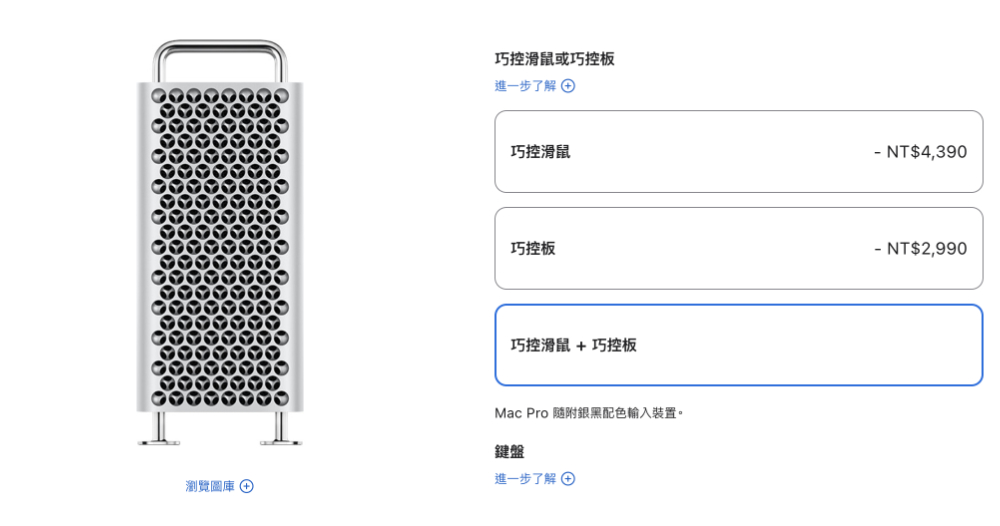 如果你將 Mac Pro 的購買頁面滾動到最底,應該會察覺到,搭配高階「Pro」蘋果桌面機型的黑色版本的配件如巧控鍵盤、巧控滑鼠以及可以透過頁面加價更換選擇的巧控板。雖然從官方的圖片看不出來是否有改版成了 USB-C 的版本。