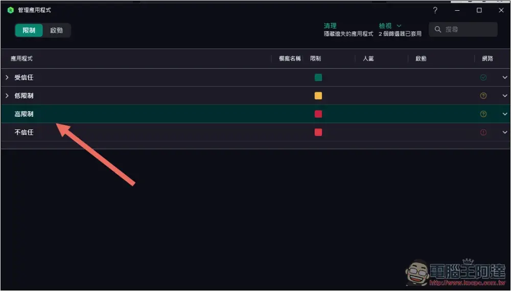 還有一個安全防護功能很棒,在入侵防禦中,可以監控當前使用的應用程式,有沒有高限制、不信任的程式在背景運行。當覺得電腦怪怪的,無緣無故效能變很慢之類,可以到這邊檢查,發現有就能立即阻擋並移除: