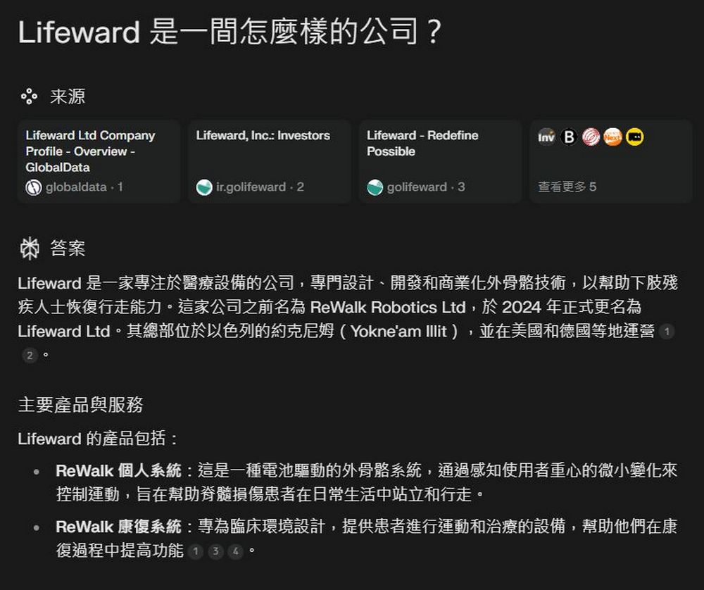 登入後就可以開始使用 Perplexity 搜尋資料,我如果今天大學報告需要寫有關 Lifeward 這家公司,我可以在 Perplexity 直接搜尋 Lifeward,Perplexity 就會幫我一次整理 Lifeward 這間公司來自哪個國家、從事哪個行業、主要產品和服務、公司發展、市場定位等等的資訊。
