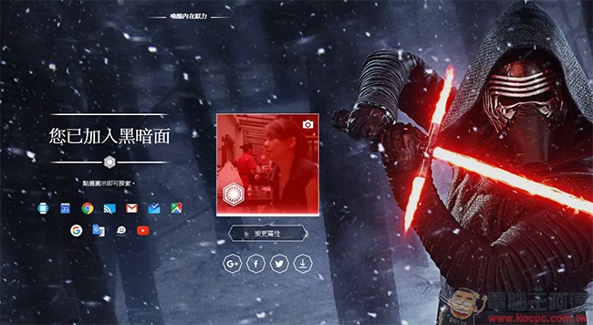 首先請點擊下方的網址,就可以進入到這個《星際大戰》風的活動頁面中。接下來登入你的 Google 帳號,在「光明面」與「黑暗面」兩大陣營中擇一效忠。