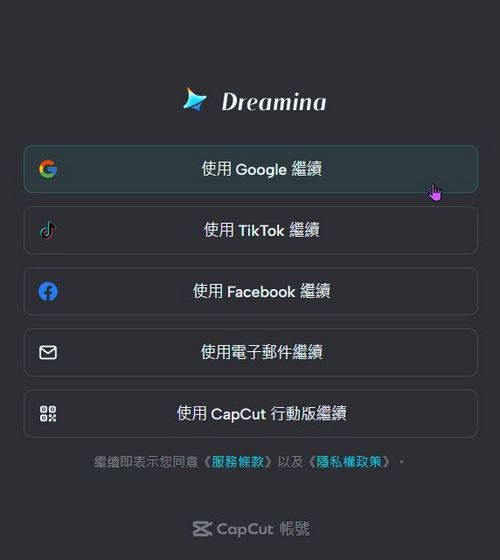 想要使用 Dreamina AI 需要先註冊會員,Dreamina AI 提供許多選擇,看是要使用 Google、TikTok、Facebook 還是使用 CapCut 行動版註冊都可以。