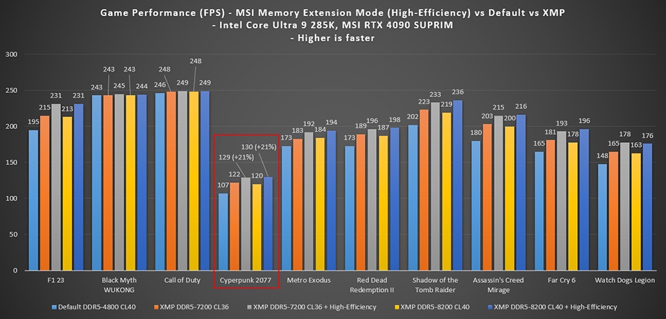 但有趣的地方在,近日 MSI 分享在 800 系列主機板中,「Memory Extension Mode」除了原有的Performance、Benchmark 與 Memtest 三種模式之外,還針對 Intel Core Ultra 處理器新增了「High-Efficiency」模式,只要啟用,就能降低 12%-16% 記憶體延遲,進而使遊戲效能提升最高達 21%,這就跟 Intel 說的不一樣: