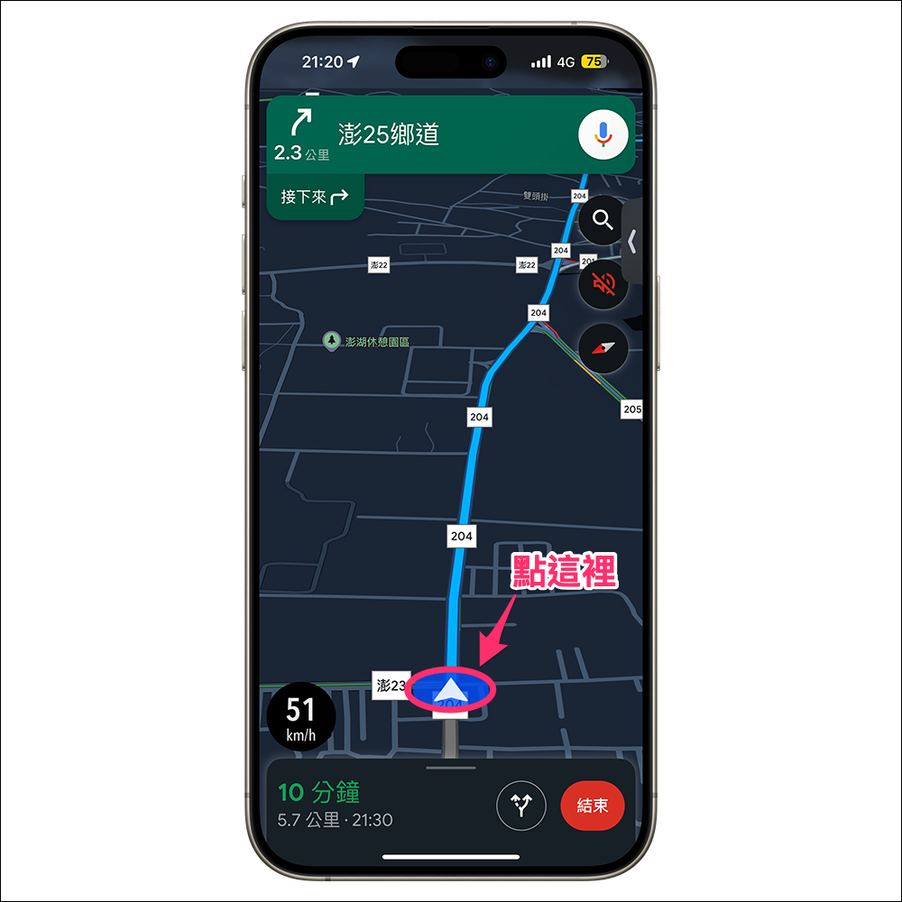 想要確認自己有沒有收到最新的 Google Maps 導航汽車圖示的話。很簡單,只需要在進入導航狀態時,點擊導航的定位點 – 預設為圓盤狀的方向圖示。就會開啟汽車導航圖示的選擇視窗。