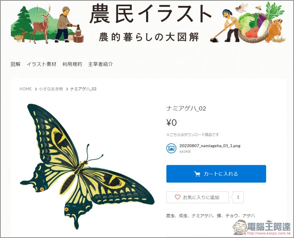 農民イラスト的素材雖然都全部免費用,但下載程序稍微麻煩一點,你必須註冊帳號,註冊完後才能下載,而且整個過程有點類似購物概念,不是直接從素材頁面下載,跟其他網站很不一樣。