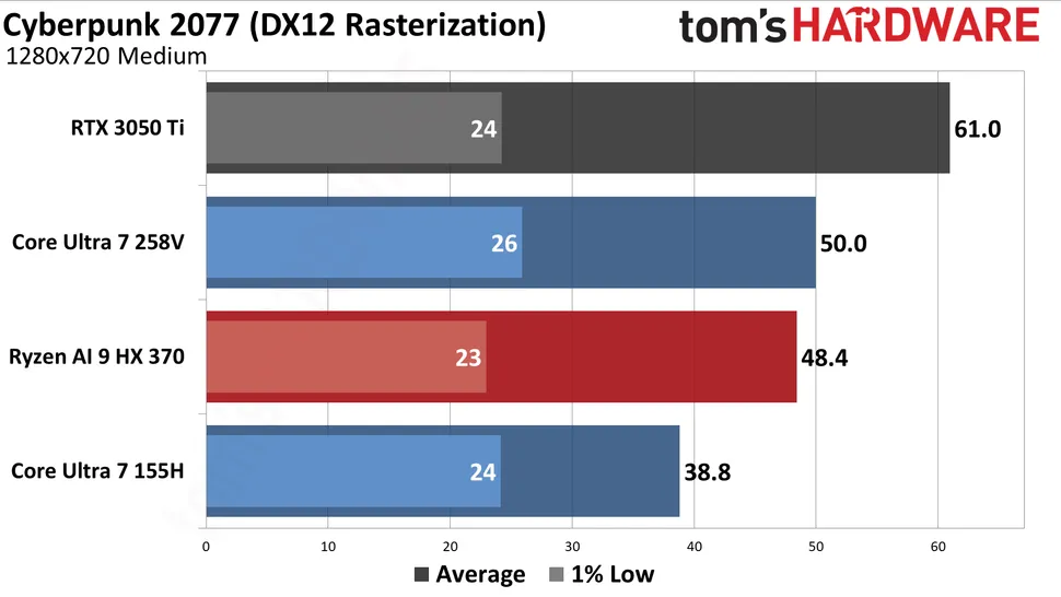 當然,AMD Ryzen AI 9 HX 370 也是有部份遊戲勝過 Intel Core Ultra 7 258V,《瘟疫傳說:安魂曲》就是,不過這款遊戲 Ultra 7 258V 的數據感覺不太正常,跟上一代幾乎一樣,因此應該也是驅動問題: