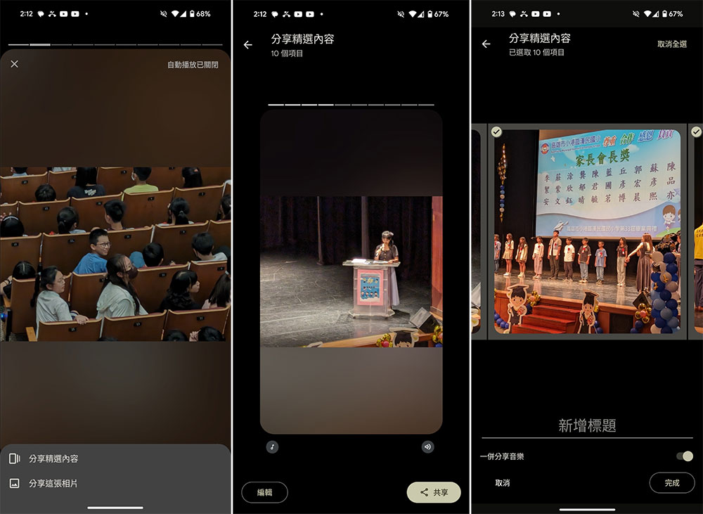 將回憶以影片分享的過程很簡單。只需點擊回憶中的分享按鈕並選擇分享精選內容即可。然後,Google 相簿會將幻燈片匯出為影片,並顯示標準的 Android 共享選單,讓你在其他應用程式之間共用。預設情況下,匯出的影片保留與在 Google 照片應用程式中播放的背景音樂相同的背景音樂,這可以提升觀賞時的體驗。