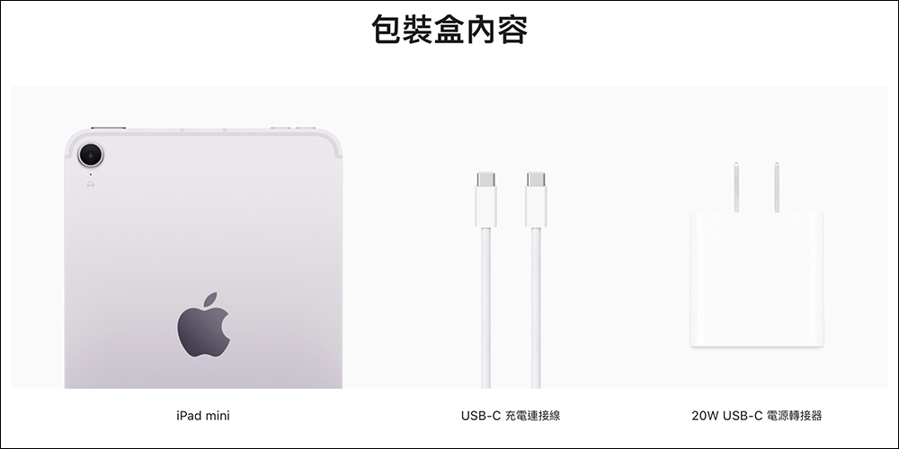 iPad mini (A17 Pro) / iPad mini 7 配件提供 USB-C 充電連接線和 20W USB-C 充電頭。